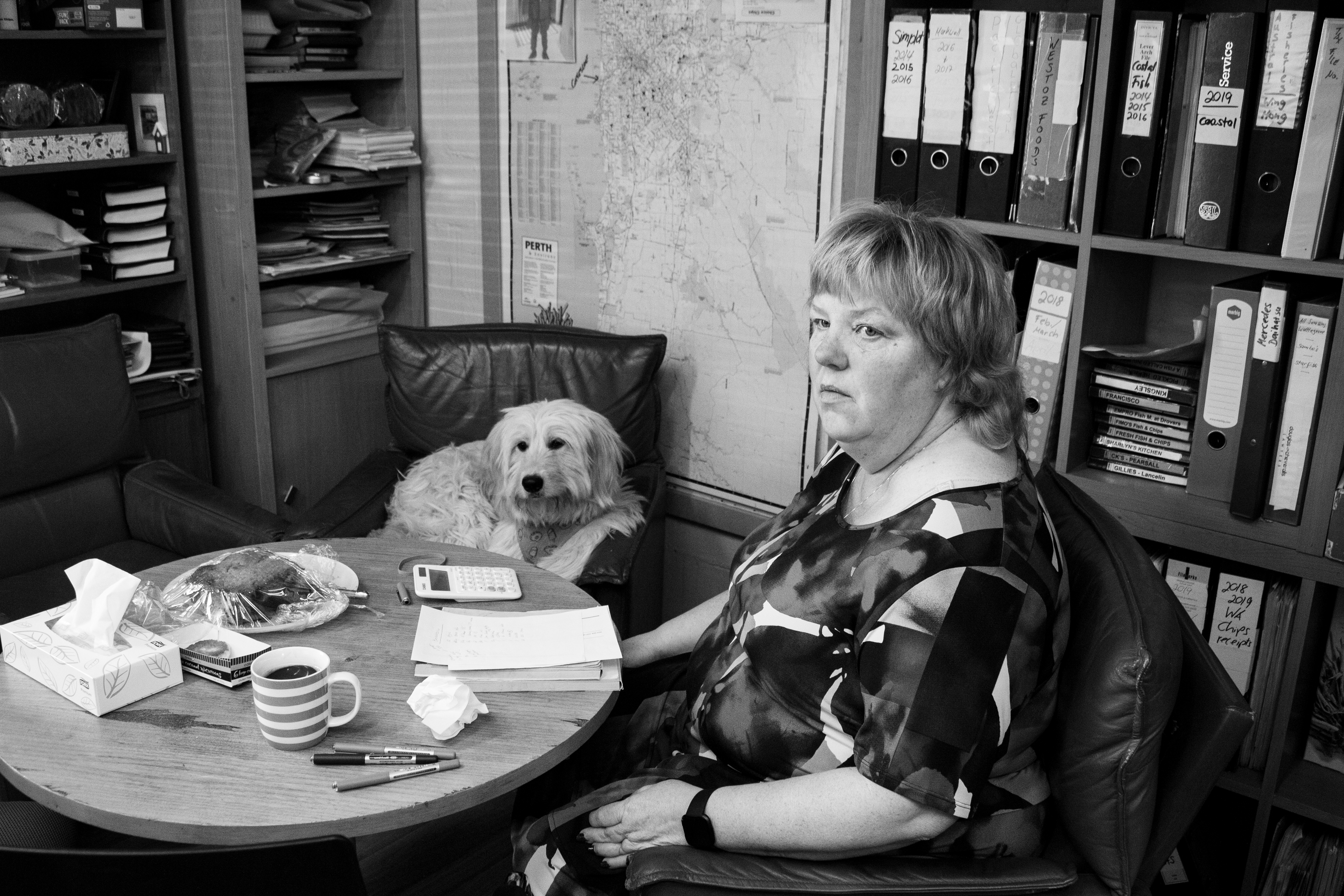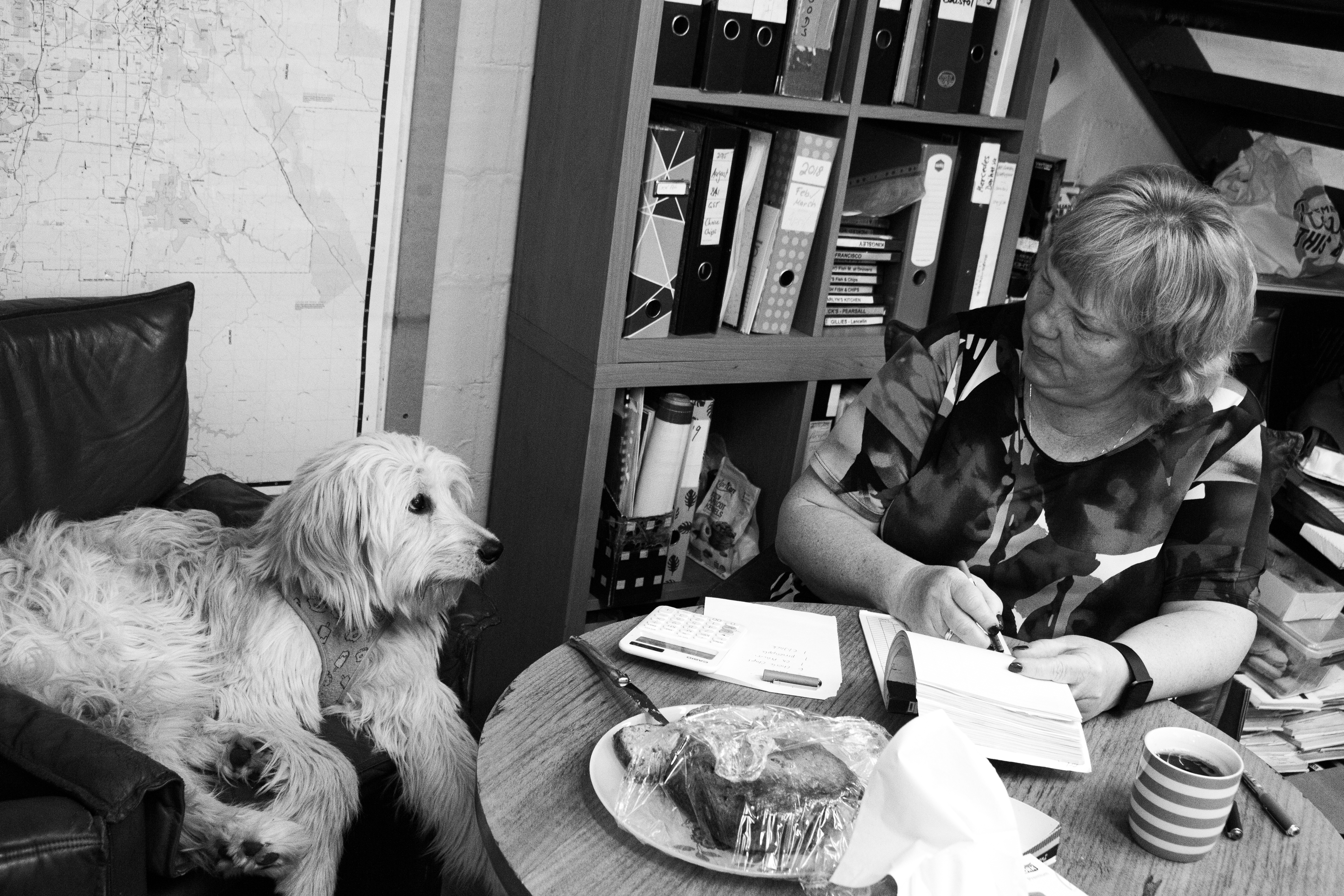 The life of the company. Daisy welcomes clients and gives comforting cuddles.